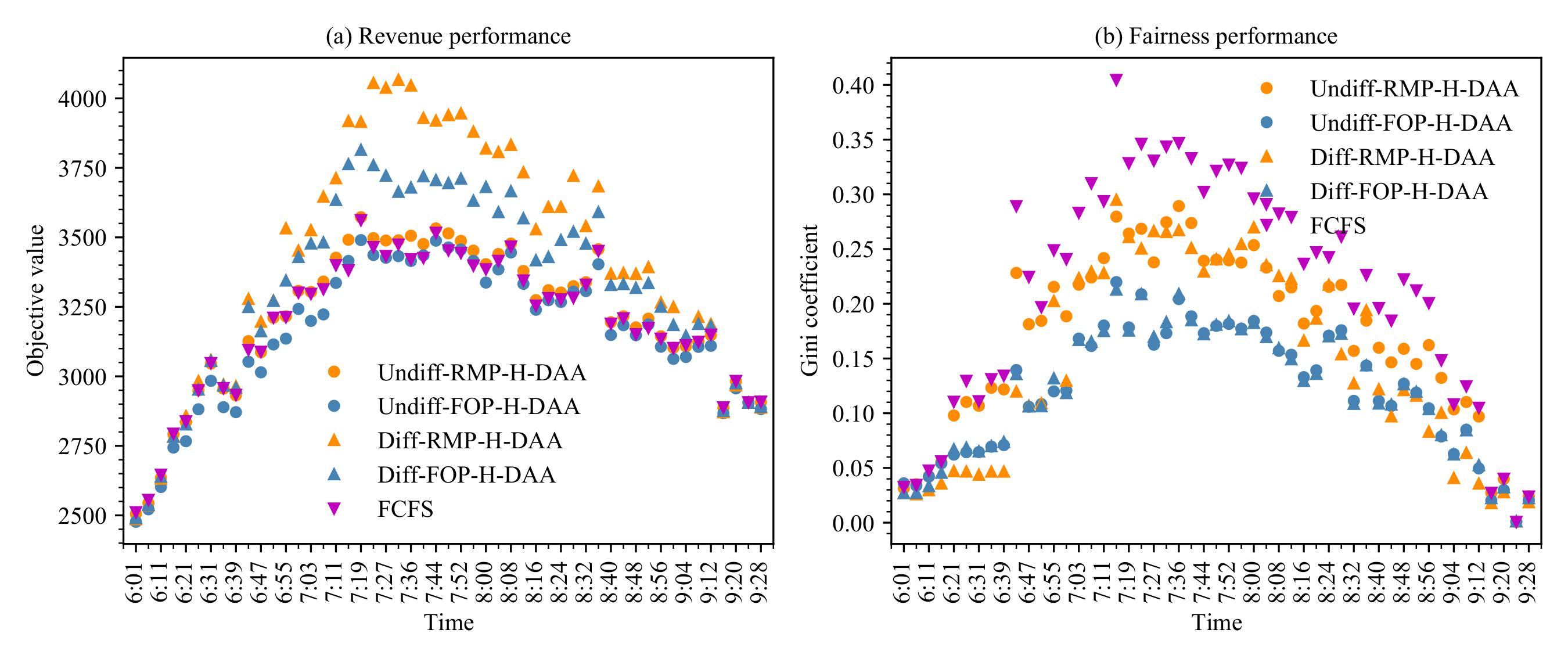 高峰时段客流拥挤是我国大城市轨道交通面临的重要挑战,其不仅会增加人群踩踏事故风险,更使得上下游车站的服务水平存在很大差异。在此背景下,设计科学合理的客流控制策略,优化每个站点的上车人数,从而提高列车容量资源的利用效率,改善服务水平公平性,具有重要的现实意义。针对客流需求的随机性和动态性特点,研究团队考虑列车到达每个站点获知该站的实时客流需求,建立了带约束的随机动态规划模型,目标是最大化列车总载客量,并满足每个起讫点乘客的服务水平约束。为求解该模型,从理论上证明了给定服务水平目标可行的充要条件,并将其拓展至同时考虑目标函数值和和服务水平约束的可行性问题,设计了近似最优的在线客流控制策略。基于北京地铁的数值试验表明,相较于当前采用的先到先上车(FCFS)策略,论文提出的H-DAA策略能显著提升系统总载客量,并改善上下游车站的公平性问题(如图2所示)。此外,该算法框架能够求解一系列带随机约束的动态规划和随机优化模型,具有较为广阔的应用前景。