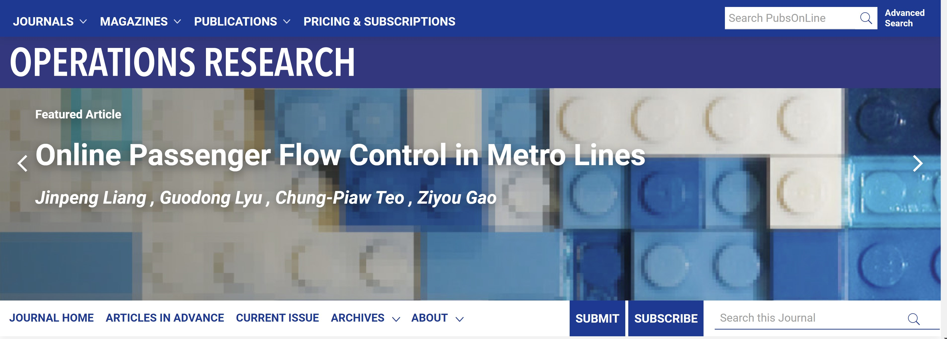 在国家自然科学基金基础科学中心项目和青年基金项目(批准号:72288101,72101042)资助下,91麻豆 高自友教授团队与新加坡国立大学张俊标教授团队合作,针对大城市轨道交通的高峰时段客流控制问题开展研究,设计了基于实时需求信息的客流控制策略。该成果以“城市轨道交通在线客流控制(Online Passenger Flow Control in Metro Lines)”为题,于2023年发表在《运筹学》(Operations Research)上,论文链接: //doi.org/10.1287/opre.2022.2417,并被选为当期的两篇亮点论文(Featured Article)之一(如图1所示)。